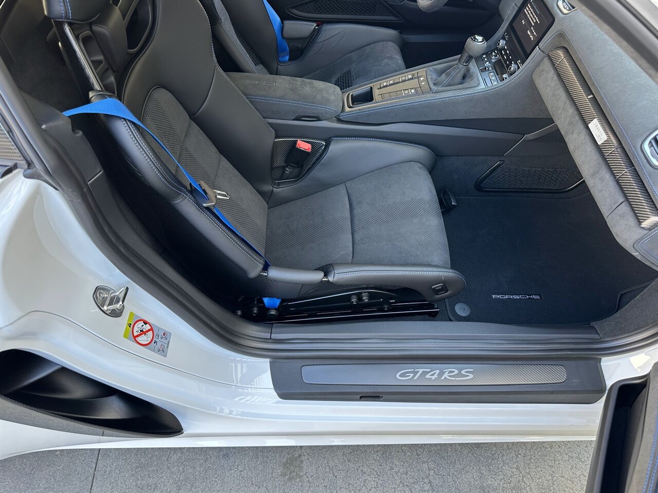 The car is further equipped with the Front Axle Lift System, improving everyday drivability, along with LED headlights with Porsche Dynamic Light System (PDLS). Inside, the cabin features full bucket seats trimmed in Leather and Race-Tex, Shark Blue door pull loops, illuminated carbon fiber door sills, and extended Arctic Grey deviated stitching throughout the interior.